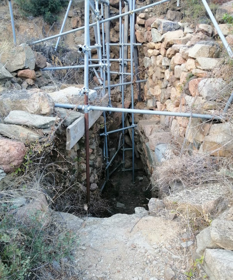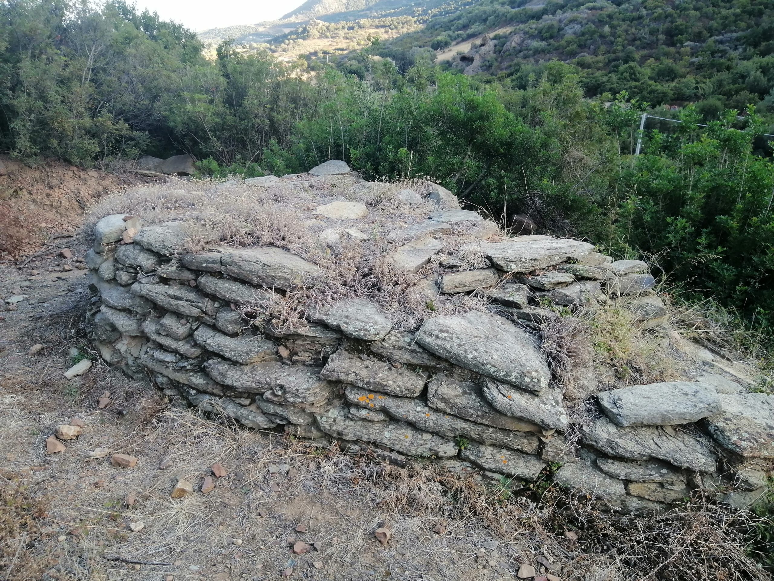 Eine sehr gut erhaltene heilige Quelle mit frischem Wasser, wo das Wasser höher drin steht als in der Umgebung. Es wurde später eine sehr kleine Nuraghe darauf gebaut, von der noch die Ränder stehen und die nach unten zum Brunnen hin ein Loch hat. Außen aus dicken Steinen, ist der Eingang ganz aus flachen Steinen, evtl. Schiefer, gebaut, ein schönes Bauwerk. Evtl. andere Bauten an diesem Ort werden gerade gesucht und ausgegraben. Es gibt noch eine Mauer.